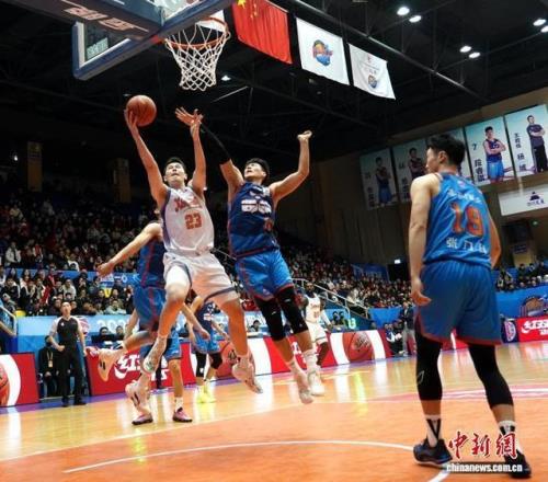 四川男籃隊員景菡一(藍衣)得到全隊最高的14分,在比分落后時扛起了球隊進攻重任。記者 呂楊攝