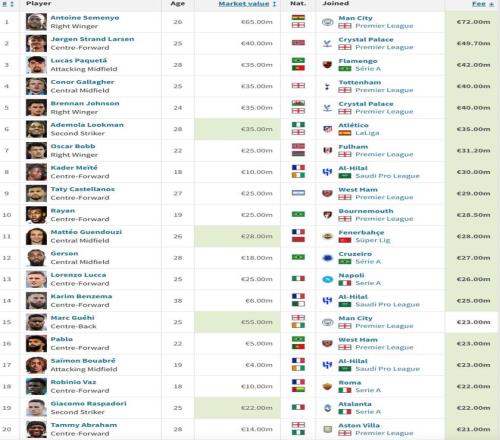 冬窗轉(zhuǎn)會榜出爐:塞門約7200萬歐領銜,拉森4970萬歐次席