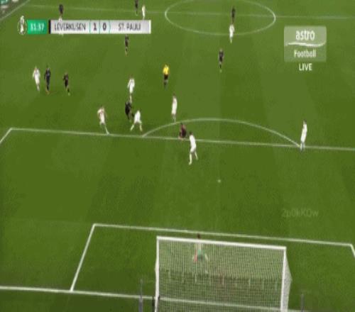 第31分鐘,泰里耶凌空抽射,皮球直掛死角,勒沃庫(kù)森1-0圣保利