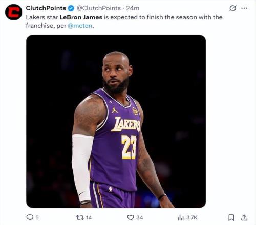 在這場比賽打到第二節(jié),根據馬克-斯坦恩的報道,詹姆斯在本賽季交易截止日不會被交易,他將繼續(xù)代表湖人出戰(zhàn)。