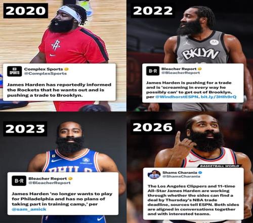 但現(xiàn)實往往事與愿違——哈登每加入一支新球隊后沒多久,“想走人”的戲碼就會上演。