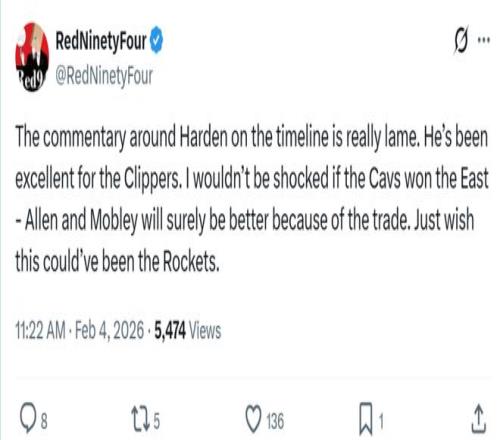 火箭媒體人RedNinetyFour第一時(shí)間祝福哈登的同時(shí),坦言火箭隊(duì)原本也有機(jī)會成為得到哈登的球隊(duì)。