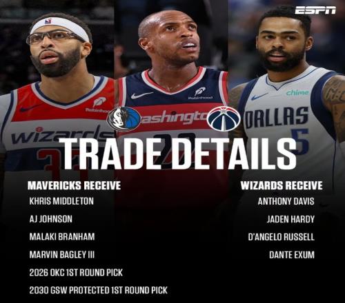 獨行俠與奇才的4換9大交易同樣震驚聯(lián)盟。安東尼·戴維斯被送往華盛頓,換回了米德爾頓、AJ·約翰遜以及2個首輪簽。具體交易信息如下: