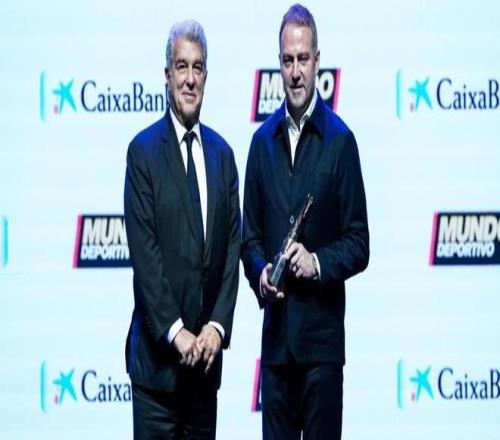 拉波爾塔在第78屆《世界體育報》年度頒獎典禮上,為弗里克頒發(fā)了獎杯。