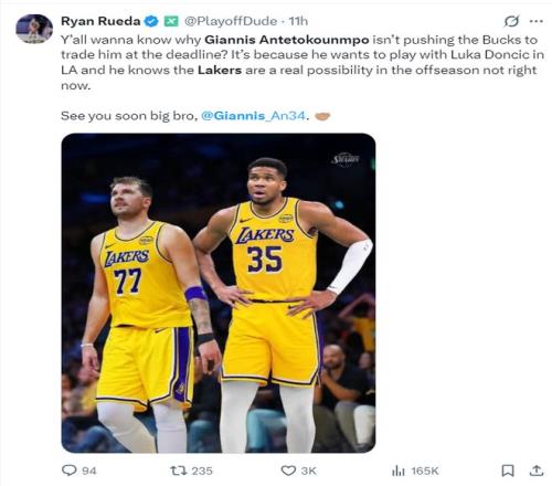 根據(jù)湖人記者Ryan Rueda的說(shuō)法,雄鹿隊(duì)沒(méi)有在交易截止日前送揚(yáng)尼斯的原因之一就是,字母哥希望在今夏與東契奇并肩作戰(zhàn),而且他知道湖人在休賽期開出的籌碼會(huì)比交易截止日更好,也能幫助雄鹿隊(duì)。