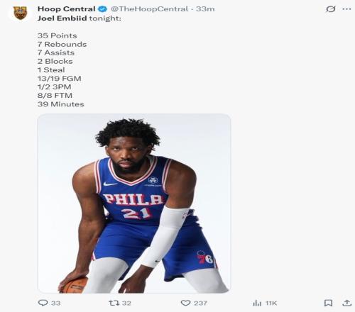 恩比德在第三節(jié)再度化身表演藝術(shù)家,朝艾頓身上跳自己倒地還去要犯規(guī),拉拉維亞不伸手他投籃抬肘擊中拉拉維亞胸口裁判給2+1,恩比德表演后兩個(gè)中投命中完成30+,三節(jié)28分鐘,恩比德15中11+三分1中1+罰球7中7拿到30分7籃板6助攻1搶斷2蓋帽。