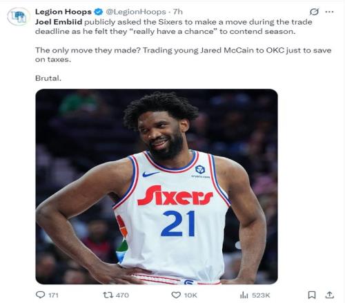 賽前根據(jù)費(fèi)城記者的報(bào)道,恩比德希望球隊(duì)在交易截止日前采取行動(dòng),因?yàn)樗J(rèn)為球隊(duì)在本賽季有希望展開競(jìng)爭(zhēng)??汕蜿?duì)唯一的運(yùn)作是將麥凱恩送到雷霆節(jié)省奢侈稅,這太殘酷了。