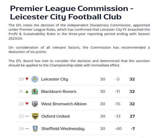 一紙官方公告,讓英格蘭足壇再次震動(dòng)。北京時(shí)間2月6日,英格蘭足球聯(lián)賽(EFL)正式宣布:萊斯特城因違反盈利與可持續(xù)發(fā)展規(guī)則(PSR),被扣除6個(gè)英冠聯(lián)賽積分。盡管違規(guī)發(fā)生在2023-24賽季,且萊斯特城當(dāng)賽季已經(jīng)完成升級(jí),但財(cái)務(wù)問題違規(guī)事實(shí)確鑿,“秋后算賬”那不跑不了的,處罰即刻生效,不設(shè)緩沖期。