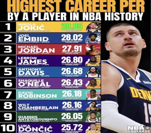 最近nba world wide coverage發(fā)布了“NBA歷史球員生涯最高球員效率值”榜單,約基奇排在第1,恩比德、喬丹緊隨其后,詹姆斯也進了前四。榜單里既有奧尼爾、張伯倫這種長期被反復對比的歷史中鋒,也有字母哥、東契奇這種還在上升期的現(xiàn)役球星。把不同時代、不同位置、不同比賽節(jié)奏下的球員放在同一張表里,光看一個“球員效率值”就把名次定死,約基奇壓過喬丹和詹姆斯排第1,這個位置到底算不算合理?