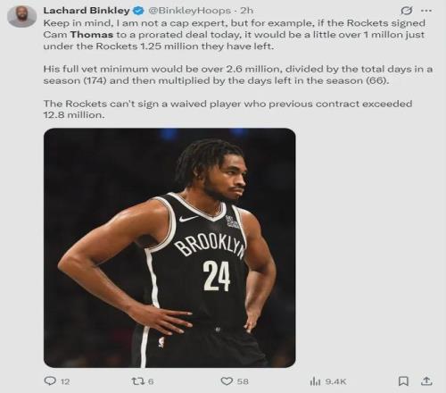 隊(duì)記Binkley對(duì)此分析道,由于火箭目前僅低于第一硬帽125萬(wàn)美元,倘若真的要簽下托馬斯,那么后者的薪資最高不超過125萬(wàn)美元,而競(jìng)爭(zhēng)者們能夠給出更高的價(jià)錢。