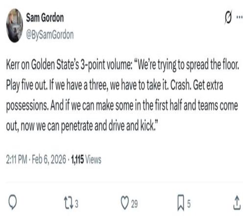 而勇士隊(duì)之所以能夠拿下勝利,主帥科爾的變陣與用人成為關(guān)鍵,半場(chǎng)瘋狂出手37記三分創(chuàng)造NBA歷史紀(jì)錄,半場(chǎng)在籃下0-3英尺僅出手5次,只造成了一次投籃犯規(guī),可謂是將對(duì)于三分投射的依賴(lài)發(fā)揮到了極致。