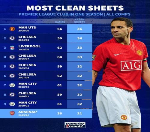 北京時間2月6日,德轉(zhuǎn)列出了英超球隊單賽季零封榜,2008-09賽季的曼聯(lián)以各項賽事66場零封36次排名第一,本賽季的阿森納38場零封21次有望最終躋身前10。