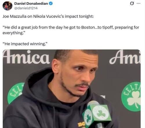 面對(duì)武切維奇這樣的表現(xiàn),賽后主帥馬祖拉稱贊到:“從他到波士頓那一天起,他就全力以赴,為每場(chǎng)開打的比賽做好準(zhǔn)備,他也用實(shí)際行動(dòng)左右了比賽的勝負(fù)走向?!?/p>