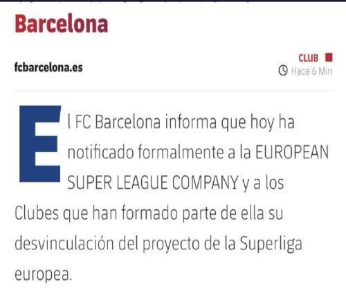 北京時間2月7日晚,西甲豪門巴塞羅那俱樂部官方發(fā)布聲明:已向歐洲超級聯(lián)賽公司及其參與組建俱樂部告知,即日起正式退出歐洲超級聯(lián)賽項目。