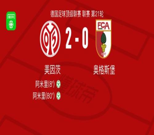 北京時(shí)間2月7日德國(guó)足球頂級(jí)聯(lián)賽 聯(lián)賽 第21輪,美因茨主場(chǎng)對(duì)陣奧格斯堡。美因茨阿米里梅開二度。最終比分美因茨 2-0 奧格斯堡。