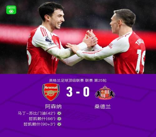 北京時(shí)間2月7日英超聯(lián)賽第25輪,阿森納主場(chǎng)對(duì)陣桑德蘭。蘇比門迪貼地遠(yuǎn)射先拔頭籌,哲凱賴什替補(bǔ)登場(chǎng)完成梅開(kāi)二度,哈弗茨兜射造險(xiǎn)。最終,阿森納主場(chǎng)3-0完勝桑德蘭,繼續(xù)強(qiáng)勢(shì)領(lǐng)跑。