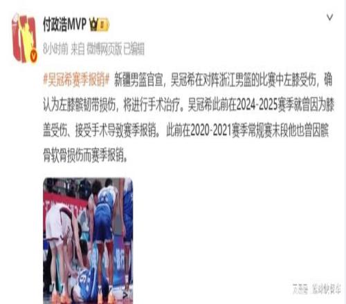 CBA聯(lián)賽又傳來一大悲劇。目前,CBA季中杯正如火如荼進(jìn)行中,不過,對(duì)于新疆男籃而言,他們卻遭遇一大打擊。球隊(duì)主力中鋒吳冠希將因傷直接錯(cuò)過本賽季,也就是我們俗稱的賽季報(bào)銷。自從2021年髕骨軟骨損傷賽季報(bào)銷后,在過去5年里,他已經(jīng)先后4次賽季報(bào)銷,成為CBA聯(lián)盟中不折不扣的玻璃人。很顯然,吳冠希的意外受傷,無論是對(duì)于新疆隊(duì),還是對(duì)于他本人,都是一個(gè)晴天霹靂。