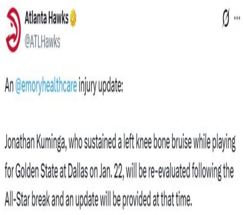 這位23歲球員在1月22日對(duì)陣獨(dú)行俠的比賽中左膝過度伸展,那場(chǎng)比賽也成為他效力勇士的最后一戰(zhàn)。隨后,庫(kù)明加與希爾德一同被交易至老鷹,勇士則得到波爾津吉斯。