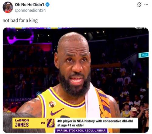 同時也成為NBA歷史上第四位在41歲后還能連續(xù)兩場交出兩雙的球員,前三人分別是帕里什、斯托克頓和賈巴爾。