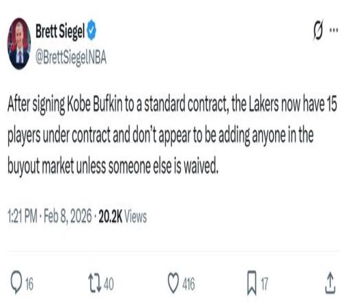 名記Brett Siegel跟進(jìn)表示,這意味著,湖人15人名單滿員,除非是裁掉某個球員,否則湖人不會在買斷市場上簽下任何球員。