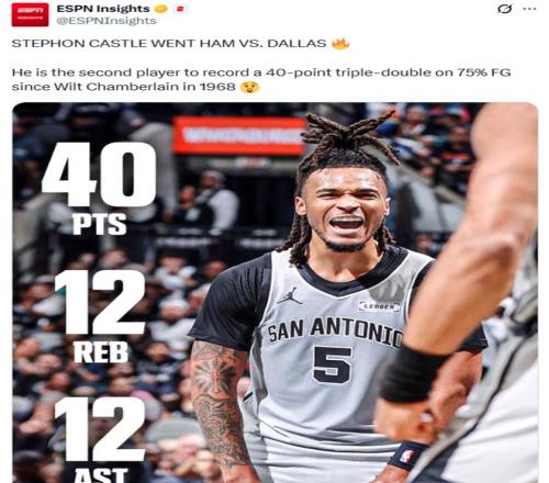 狂轟40分12板12助超級大三雙,4號秀卡斯爾牛馬大戰(zhàn)刷爆紀錄搶戲文班!馬刺隊4大新星齊暴走天賦溢出。