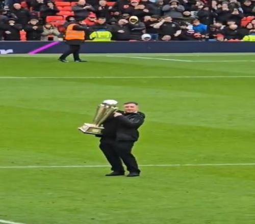 飛鏢世錦賽冠軍利特勒現(xiàn)場觀戰(zhàn),并在中場休息時,當(dāng)著曼聯(lián)球迷的面高舉自己的世錦賽獎杯展示。
