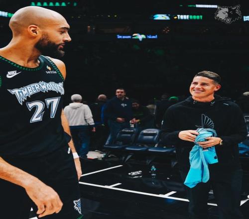 賽后,J羅與森林狼中鋒戈貝爾合影留念,并送上明尼蘇達(dá)聯(lián)10號(hào)球衣,也獲得了戈貝爾贈(zèng)送的簽名球衣。
