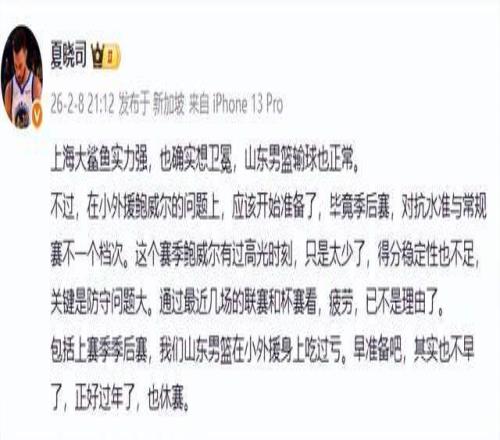 那么,山東男籃到底輸在哪里了呢?賽后,山東媒體人夏曉司在社交平臺給出了自己的答案。