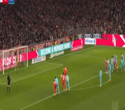第45分鐘,迪亞斯突入禁區(qū)被撞倒,主裁判再次判罰點球,凱恩主罰點球右腳勁射破門,2比1!