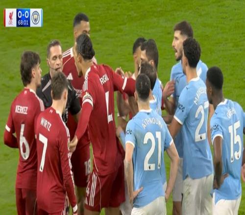 第68分鐘,薩拉赫形成單刀被格伊拉倒,主裁判鮑森并未第一時(shí)間判罰點(diǎn)球,這讓利物浦球員非常不滿。隨后,兩隊(duì)球員都圍住了鮑森,鮑森此時(shí)向格伊出示黃牌。