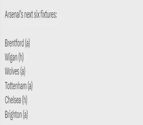 阿森納未來6場比賽:客戰(zhàn)布倫特福德、主戰(zhàn)維岡、客戰(zhàn)狼隊、客戰(zhàn)熱刺、主戰(zhàn)切爾西、客戰(zhàn)布萊頓。