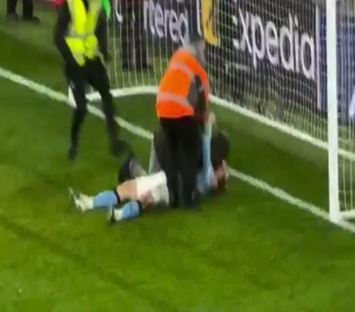 北京時間2月9日英超第25輪,曼城2-1逆轉(zhuǎn)擊敗利物浦。本場比賽最后時刻曼城曾打進(jìn)第三個進(jìn)球,但這粒進(jìn)球隨后被判無效。在這粒進(jìn)球發(fā)生后,與索博斯洛伊發(fā)生肢體接觸后倒地的哈蘭德順勢躺在球門附近,此時一名球迷沖入球場擁抱哈蘭德,隨后被安保人員拉走。