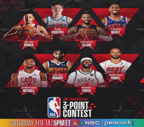 近日NBA官宣全明星三分大賽參加名單,分別有布克(太陽)、克尼佩爾(黃蜂)、利拉德(開拓者)、馬克西(費(fèi)城)、米切爾(騎士)、穆雷(掘金)、波蒂斯(雄鹿),以及鮑威爾(熱火)。