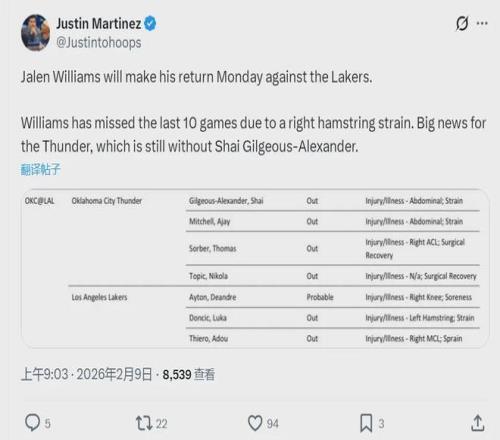 北京時(shí)間2月9日,雷霆官方宣布:亞歷山大(腹部拉傷)、阿杰伊-米切爾(腹部拉傷)索伯(右膝十字韌帶撕裂)、托皮奇(睪丸手術(shù)),將缺席明天和湖人的比賽。此外,已經(jīng)連續(xù)缺席10場(chǎng)比賽的杰倫-威廉姆斯,將在明天復(fù)出!