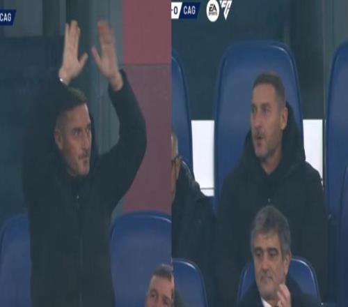 比賽進(jìn)行至第6分鐘左右,現(xiàn)場羅馬球迷集體高唱口號(hào)“C’è solo un capitano(只有一個(gè)隊(duì)長)”。轉(zhuǎn)播鏡頭隨后切向看臺(tái),托蒂起身向球迷揮手,并鼓掌致意,現(xiàn)場隨即響起進(jìn)一步掌聲。