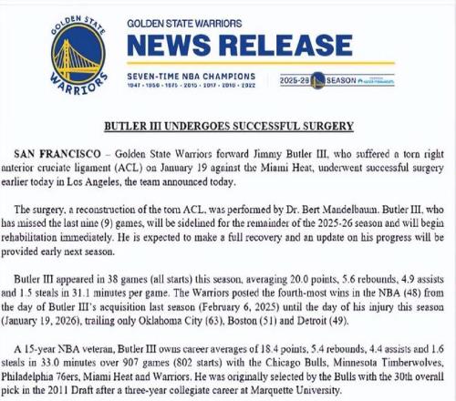 北京時間2月10日,金州勇士隊今日宣布,球隊前鋒吉米-巴特勒于今日早些時候在洛杉磯成功接受手術。巴特勒在1月20日對陣邁阿密熱火的比賽中右膝前十字韌帶(ACL)撕裂。