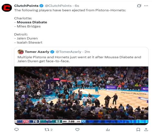 北京時間2月10日,活塞與黃蜂的比賽中爆發(fā)巨大沖突,NBA再一次上演了全武行,在裁判將兩隊(duì)的球員分開后,裁判看了回放直接驅(qū)逐了四人:迪亞巴特、布里奇斯、杜倫、斯圖爾特,最終兩隊(duì)都沒討到便宜。