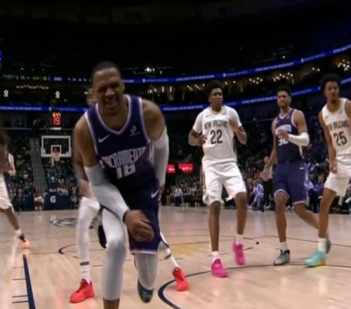 易邊再戰(zhàn),錫安連續(xù)突破得手一人連拿6分,特雷-墨菲三分連中,鵜鶘領(lǐng)先國王多達(dá)21分。阿丘瓦上籃不中,威少?zèng)_刺跟進(jìn)收下前場板并順勢完成隔人補(bǔ)扣,開心笑了。威少強(qiáng)突不慎踩到對(duì)手腳背明顯崴腳,表情痛苦,但好在并無大礙,鵜鶘竟然選擇挑戰(zhàn),最終失敗血虧還送兩次罰球??ㄌ厥д`,墨菲三世搶斷后助攻菲爾斯完成快攻得分,米西再暴扣打成2+1,鵜鶘打出一波17-2超級(jí)攻擊波,已經(jīng)領(lǐng)先國王到30分。