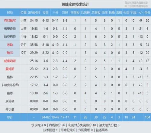 黃蜂的9連勝被終結(jié),最后來(lái)看看比賽數(shù)據(jù),說(shuō)說(shuō)你的心情:
