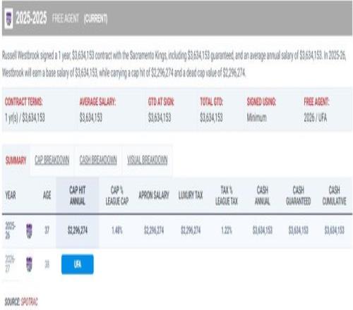 很難想象這支國王隊(duì)唯一能讓球迷駐足的球員會(huì)是37歲的威少,這是一個(gè)已經(jīng)拿了4年低廉薪水的老將,2022年784萬、2023年383萬、2024年560萬、2025年330萬、2026年363萬。