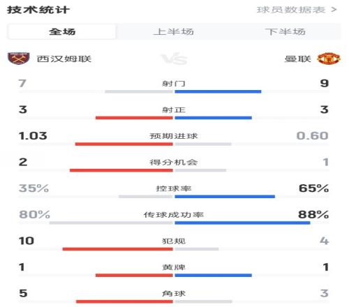 西漢姆11曼聯(lián)全場數(shù)據(jù):射門79,射正33,控球率35%65%