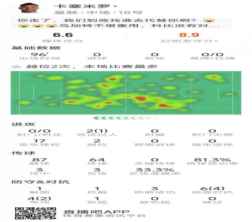 體育播報2月11日宣 在本輪英超,曼聯(lián)1-1戰(zhàn)平西漢姆,卡塞米羅進(jìn)球被吹無效,以下為他在本場數(shù)據(jù):