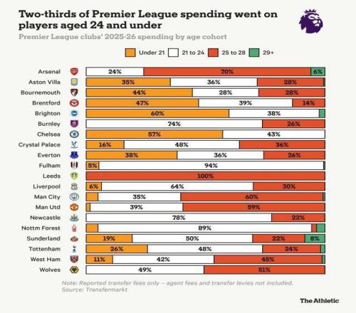 TA:英超球隊49%的轉(zhuǎn)會支出流向了21至24歲年齡段的球員