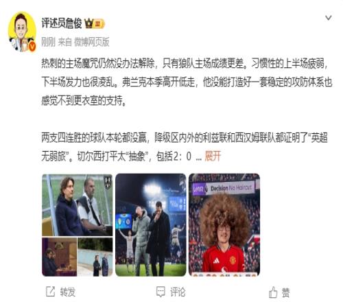 體育播報(bào)02月11日宣 本輪英超結(jié)束多場(chǎng)對(duì)陣,曼聯(lián)1-1西漢姆,切爾西2-2利茲聯(lián),熱刺1-2紐卡。賽后評(píng)述員詹俊發(fā)文。