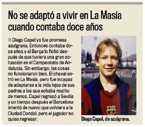 迭戈-卡佩爾1988年2月16日出生于阿爾梅里亞的阿爾波什,出道于家鄉(xiāng)球隊(duì)奧盧拉青訓(xùn)營。2000年時(shí),巴塞羅那從奧盧拉帶走了卡佩爾,不過僅僅過了半年,卡佩爾就因?yàn)橐钟艋氐搅藠W盧拉。此后,卡佩爾還曾在東方體育以及塞維利亞接受過足球培訓(xùn)。
