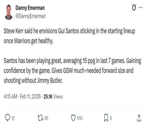 隊記Danny Emerman曝出,勇士主帥科爾公開表示哪怕球隊恢復(fù)健康,自己也會讓桑托斯繼續(xù)留在首發(fā)陣容。
