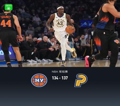 加時(shí)賽尼克斯布倫森拿下5分,步行者昆頓-杰克遜拿下7分,最終尼克斯134-137不敵步行者