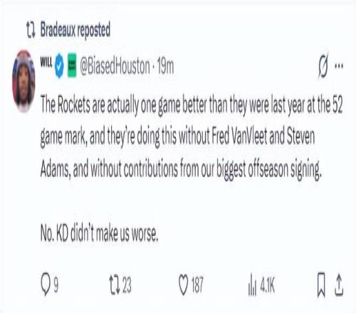火箭升西部第3!前52戰(zhàn)33勝超去年休媒:杜蘭特并沒(méi)有讓我們更糟