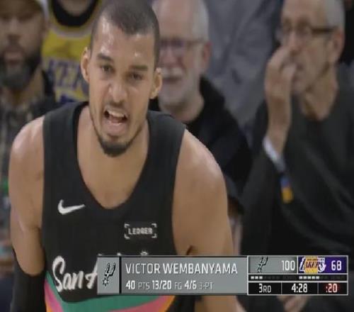 首節(jié)八分鐘便投籃9中8以接近100%命中率獨攬25分,最終文班亞馬全場出戰(zhàn)約26分鐘就爆砍40分12板大號兩雙,成為NBA史上首位取得該數(shù)據(jù)的球員。