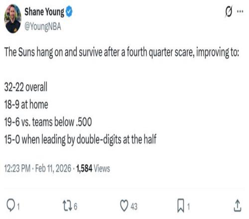 拿下勝利后太陽隊(duì)?wèi)?zhàn)績提升至32勝22負(fù),繼續(xù)占據(jù)西部第七的同時(shí),將落后身前西部第5湖人與第6名森林狼之間的差距縮小到0.5個(gè)勝場,再度向西部前六發(fā)起沖擊。